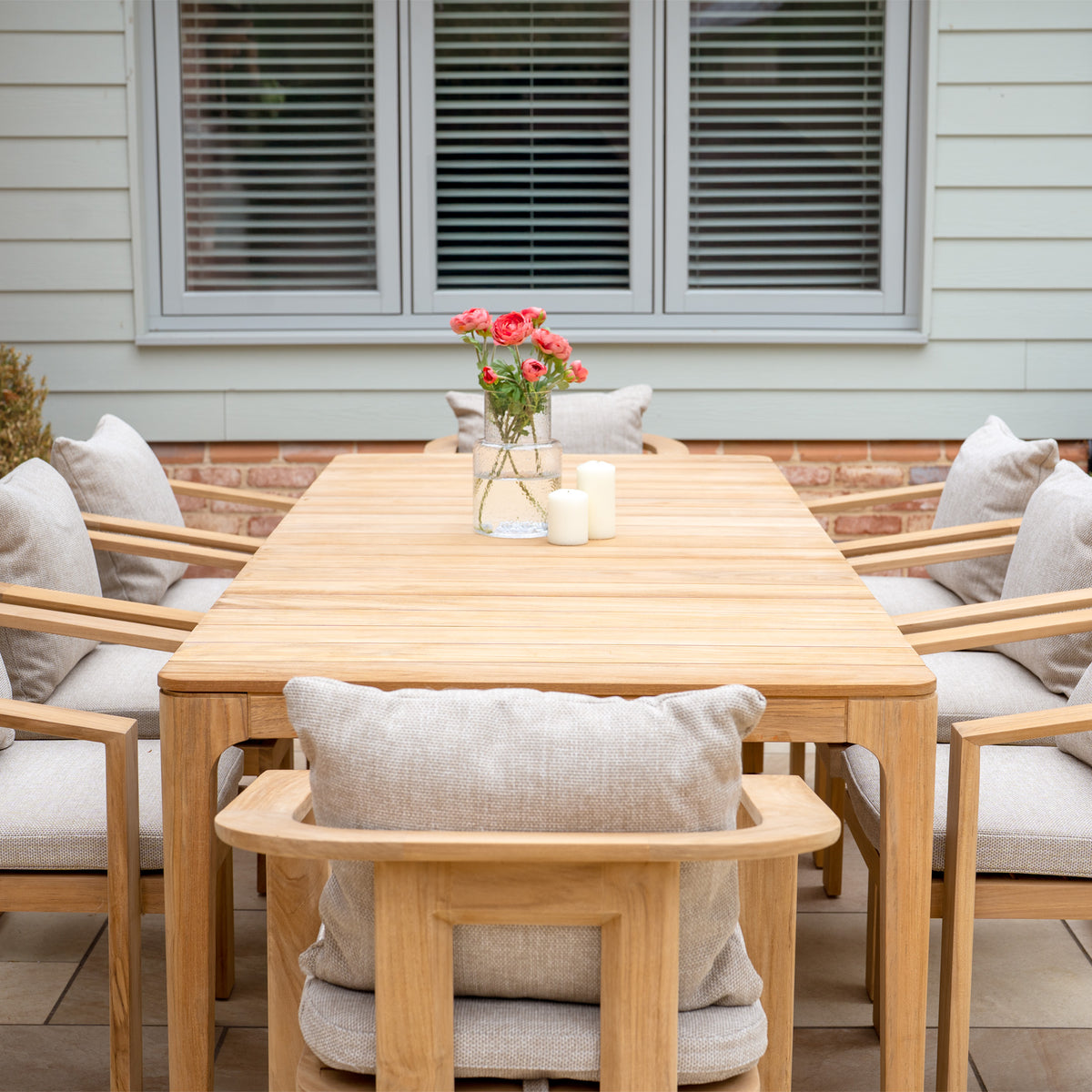 Unite your loved ones together when dining with the Tivoli 8 Seat Dining Set with Teak Dining Table in Fawn. This stylish and sophisticated dining set is crafted to provide you with lasting comfort, thanks to the thick, deep-filled cushions and protected teak frame. Boasting an elegant design, this set features a beautifully crafted teak dining table, designed to  become the centrepiece of your garden space.