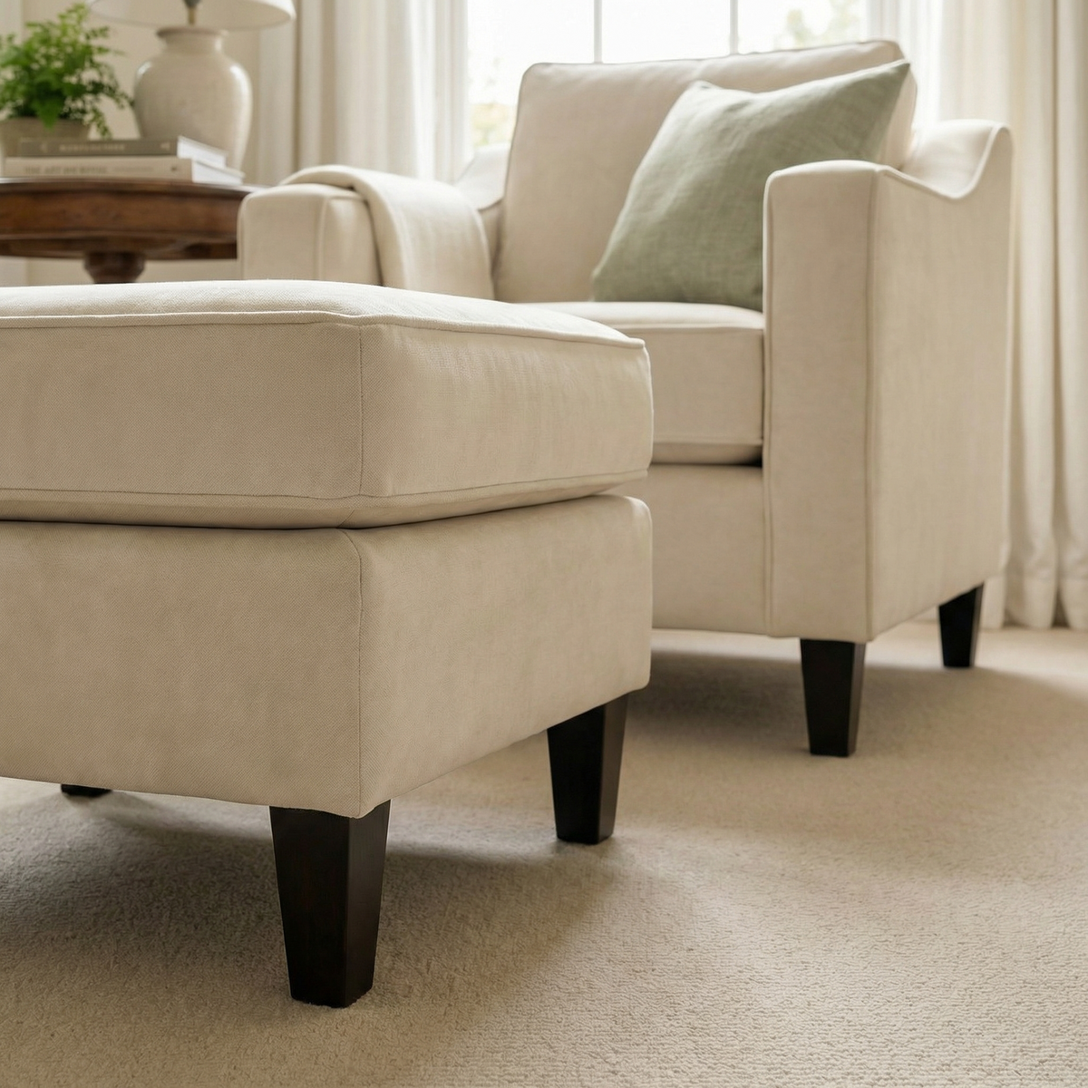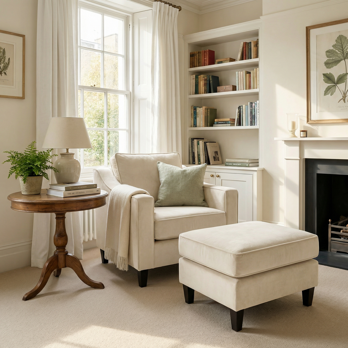 The Wiltshire Velvet Armchair in Cream, featuring a plush cushion and sustainable wood frame, handmade in England, sits on a woven rug in a cozy, sunlit living room.